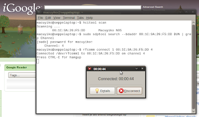 But you don’t have to create the files from steps 4 and 5. We could automate the connect-step as well, but since the N95’s channel changes from time to time, this wouldn’t be very convenient. Also, I like having a terminal open to notify me that I’m still surfing via my phone.